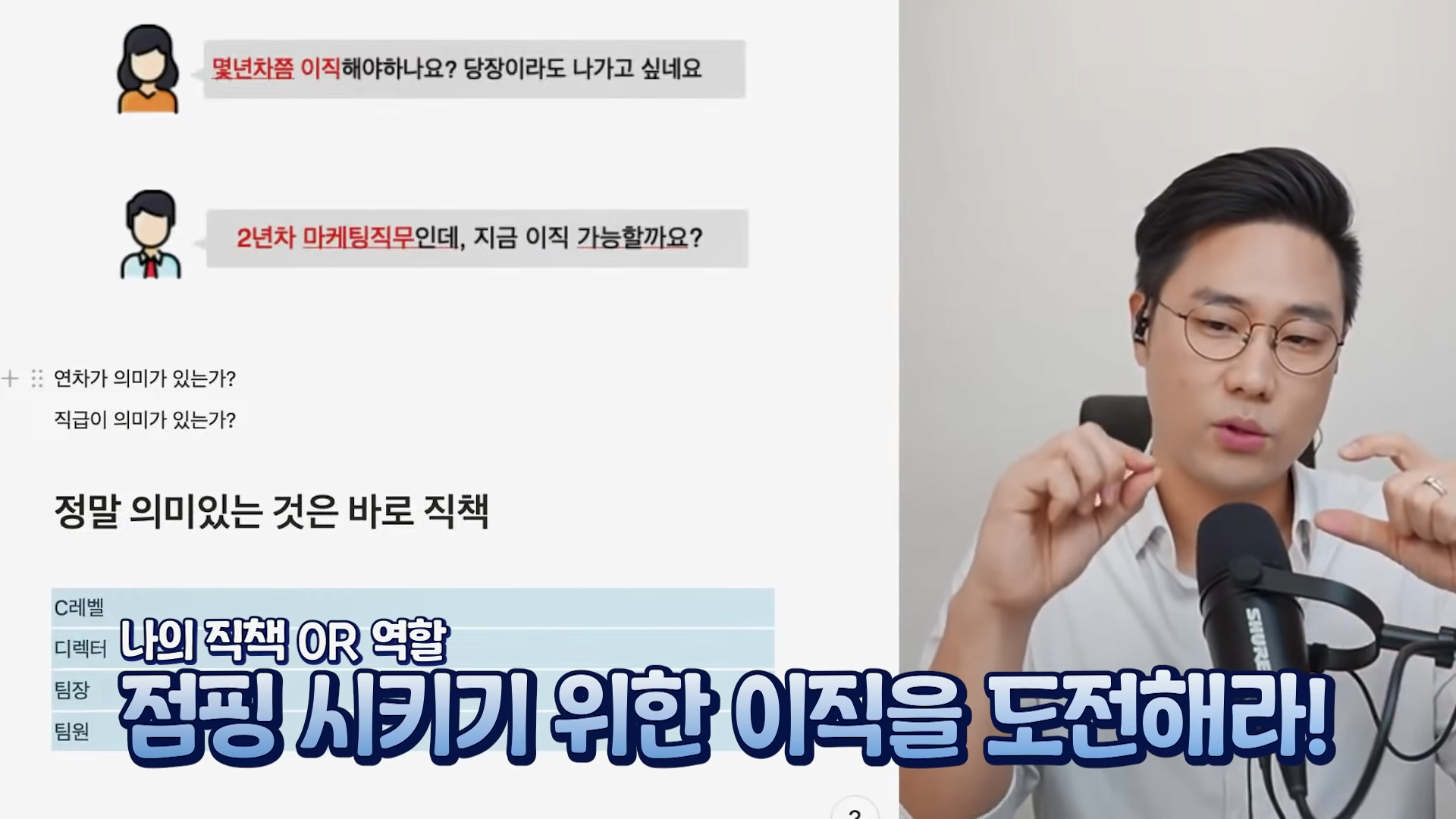 이직의 기준? 직책. 내가 맡았던 직책에 따라 시장 몸값이 달라진다. 나의 역할 레벨을 점핑해야 하는데 기회가 없다면 이직. 3,5,7 3년이 적기. 나의 직책 또는 역할을 점핑 시키기 위한 이직을 도전하라.
