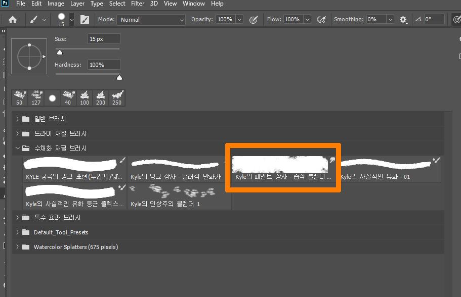 급하게 하느라 모양이 엉망이다. 브러시 선택후 위에 강도 strength를 약하게 해서 멋있게 얼굴을 가려주면 된다.