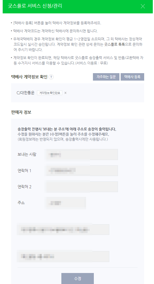 4. 굿스플로 서비스 신청/관리 메뉴에서 판매자 주소를 수정한다.
