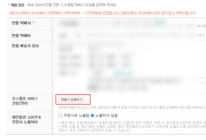 3. 배송 정보 란에서 굿스플로 서비스 신청/관리 - 택배사 등록하기를 선택한다.