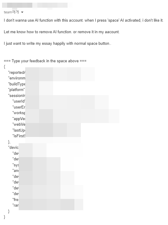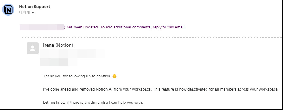 이렇게 친절하게 노션에서 ai 기능을 없애준다. 이게 일시적으로 비활성화인지 영구적으로 사용 못하는지는 아직 모르겠다. 나중에 필요하면 또 요청해보지 뭐.
