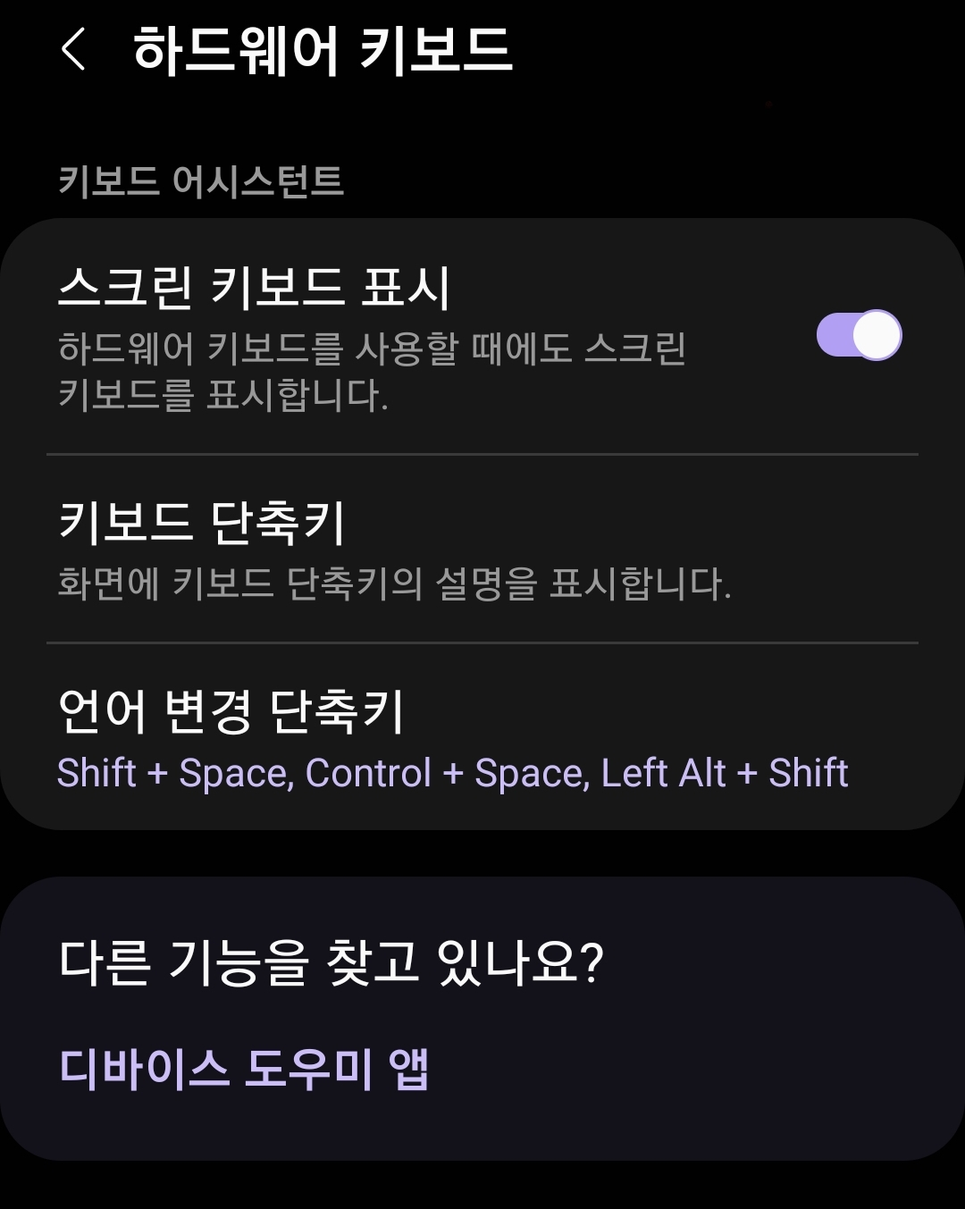 사용하는 스마트폰-설정-하드웨어 키보드-스크린 키보드 표시 -끄기