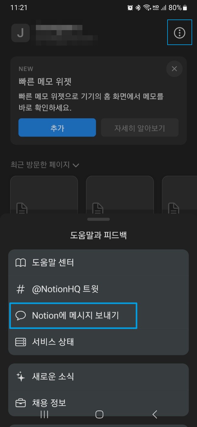 폰에서 이름 옆에 설정-노션 notion에 메시지 보내기를 선택한다. 그러면 내 기기 정도가 첨부되어 이메일이 아래처럼 쓸 수 있다.