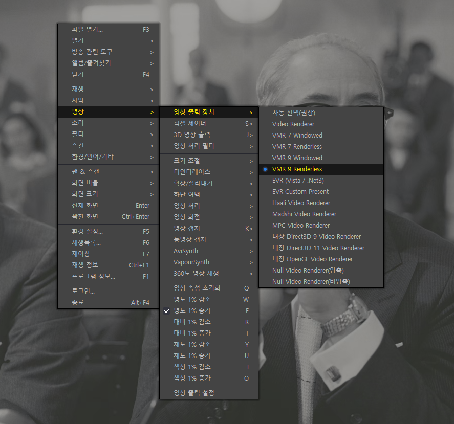 ㅡ보통은 밝기만 올릴때는 E 버튼 두번 누르면 되었는데 최근에 특정 영상이 되지 않아서 위의 방식으로 해결이되었다. 나의 경우 자동선택으로 되어 있었다. VMR9으로 바꾼 뒤에는 W,E 버튼을 누르며 발긱 조절이 가능했다. 끝.ㅡ원인은 모르겠다. Haali나 Madshi 또는 VMR7 등으로 설정되어 있으면 높은 확률로 명암 조정이 안되었다.