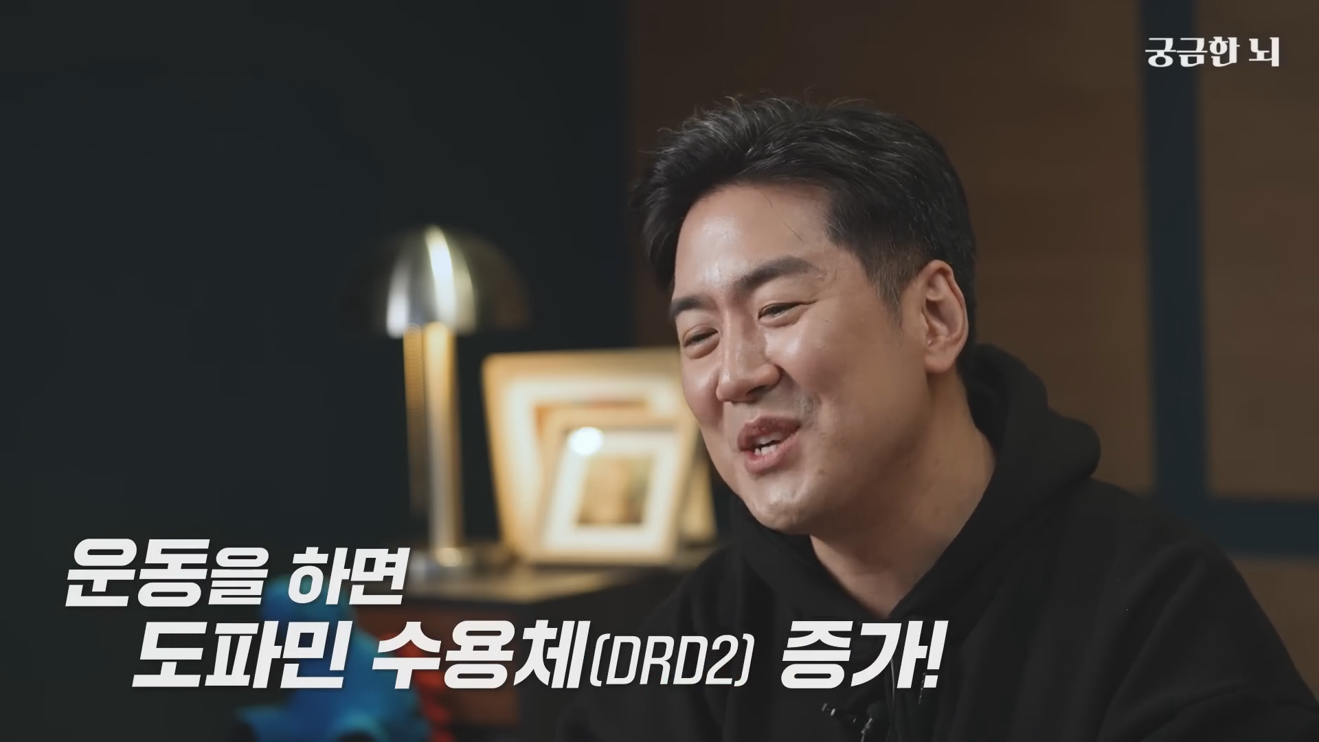 drd2 수용체가 줄어들게 되는 건 뭐라고 해석할 수 있냐 냐면이 자극이 않으면 다른 자극에 의해서는 기쁨이나 쾌락을 얻기 어려워진 상태가 된다라고 볼 수가 있는 거고 근데 흥미롭게도 운동을 하면 drd2 수용체 숫자가 늘어나요 내가 운동을 열심히 한다 평소에 느끼지 못하던 기쁨을 다시 만끽할 수 있게 되는 거예요