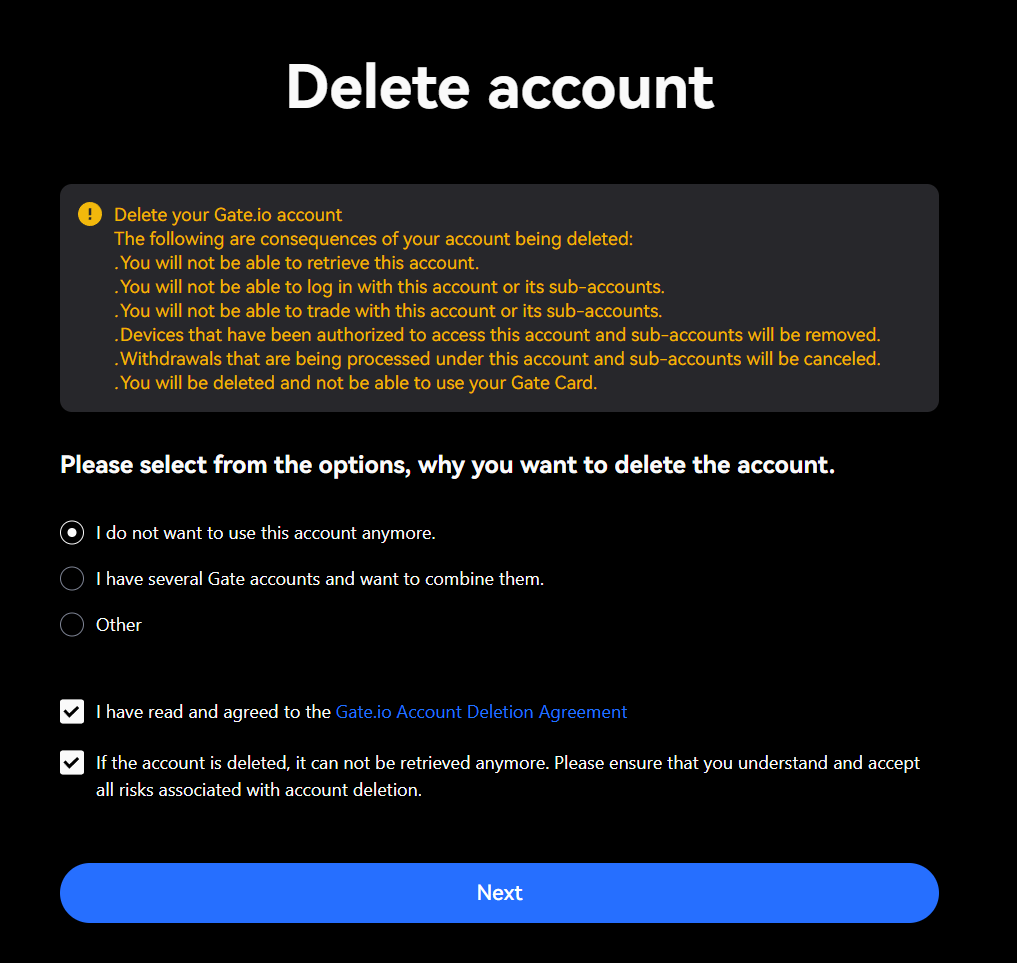 게이트 아이오는 계정 비밀번호와 펀드 비밀번호가 두개 있었다. 가입한지 오래되어서 까먹은건지도 모른다. 위에 안내대로 펀드 비밀번호를 초기화 하고 다시 계정 삭제 절차를 진행하면 정상적으로 탈퇴가 잘 된다.