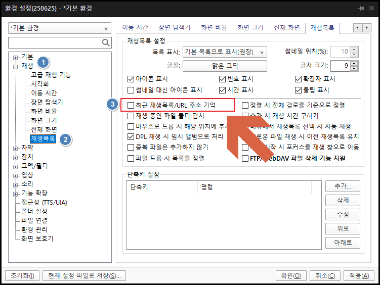 최근 재생목록/URL 주소 기억 체크 표시를 해제해주자