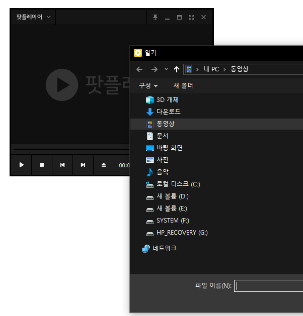 팟플레이어를 종료하고 난 뒤에 다시 재생 버튼을 누르면 이전에 불러온 영상이 자동으로 재생된다.