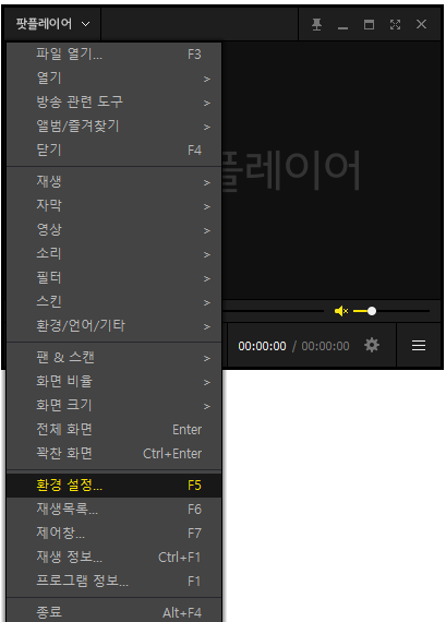 일단 팟플레이어를 켜고 환경설정으로 들어간다